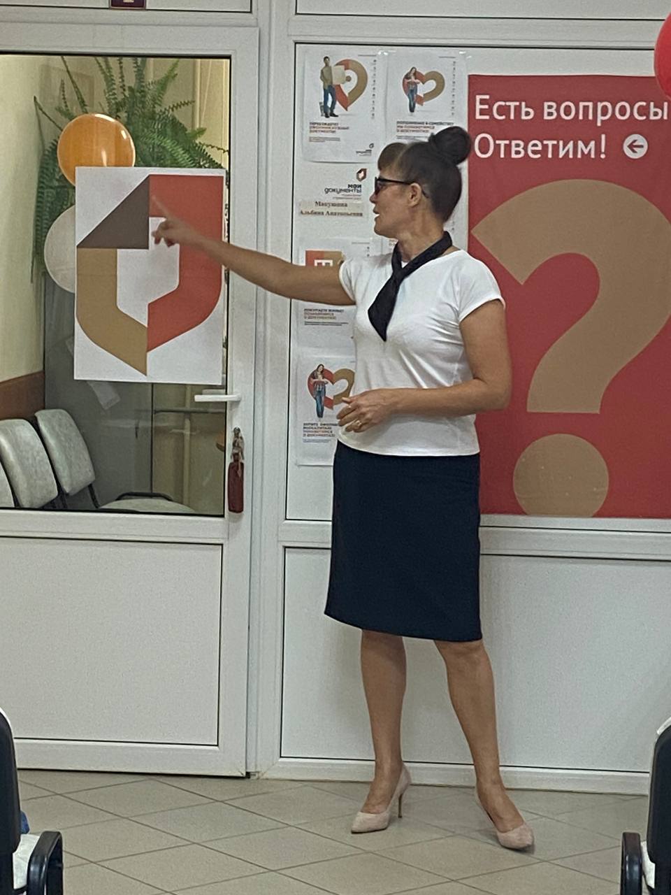 Заведующий Филиала А.А. Макушина коротко рассказала об истории праздника, о МФЦ и количестве предоставляемых услуг, о едином бренде «Мои документы» и подробно остановилась на фирменном знаке МФЦ: благодаря асимметричной конструкции новый фирменный знак МФЦ выглядит живым и меняющимся, демонстрирует изменения в динамике, что соответствует духу МФЦ как стремительно развивающемуся институту. А многозначность логотипа показывает многогранность системы МФЦ. В пластичном знаке соединились контуры герба (что указывает на принадлежность к государству), документа (передает суть услуг), ростка (подчеркивает нацеленность в будущее) и маркера геолокации (что отражает технологичность, а также присутствие в глобальном и локальном масштабах).